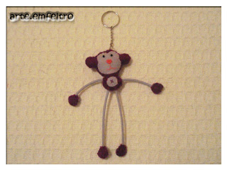 Chaveiro de macaco em feltro, com enchimento em fibra, detalhe para o olho em miçanga e os braços e pernas em elástico.